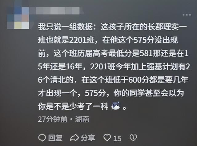 近日,长沙一位化名为小凯的男生得知了自己高考575分的成绩。